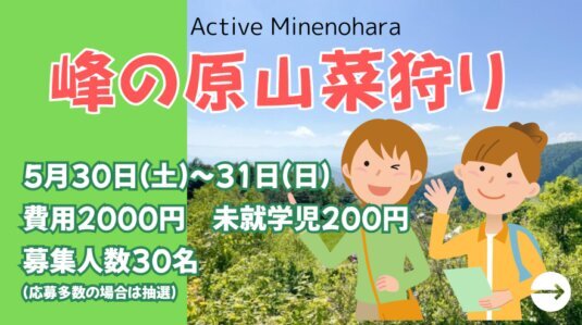 - 峰の原山菜採り 5月30日(土)~31日(日)費用 2000円・未就学児200円 募集人数 30名(応募数多数の場合は抽選)