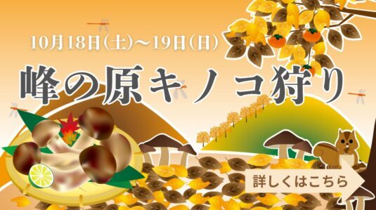 19日(日) 午前中キノコ狩り(雨天決行) 昼食は松茸ごはんとキノコ汁 午後は抽選会を予定。